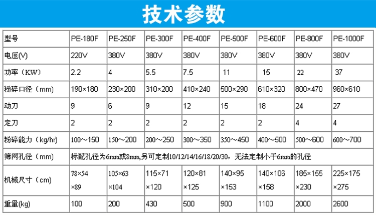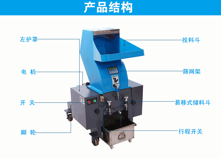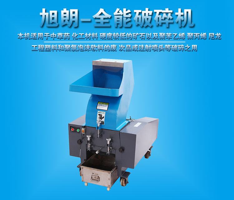 二.本机适用于中草药、化工材料、硬度较低的矿石以及聚苯乙烯、聚丙烯、尼龙、工程塑料和聚氯泡沫软料的废、次品或注射喷头等破碎之用。如更换相应的筛孔板,并调整刀片间隙,还可破碎各种吹塑膜、压延膜、薄片、薄板等塑料废品。