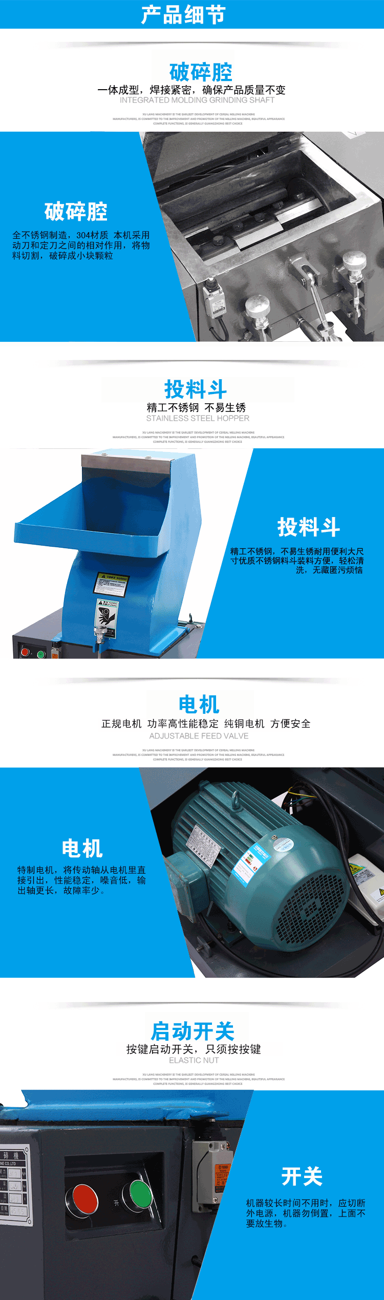 一.本司生产的全能破碎机结合了国内外行业的先进经验后改造生产的新型设备,具有质量轻,能耗低,刀片材料优良,使用寿命长,清洗方便等优点。