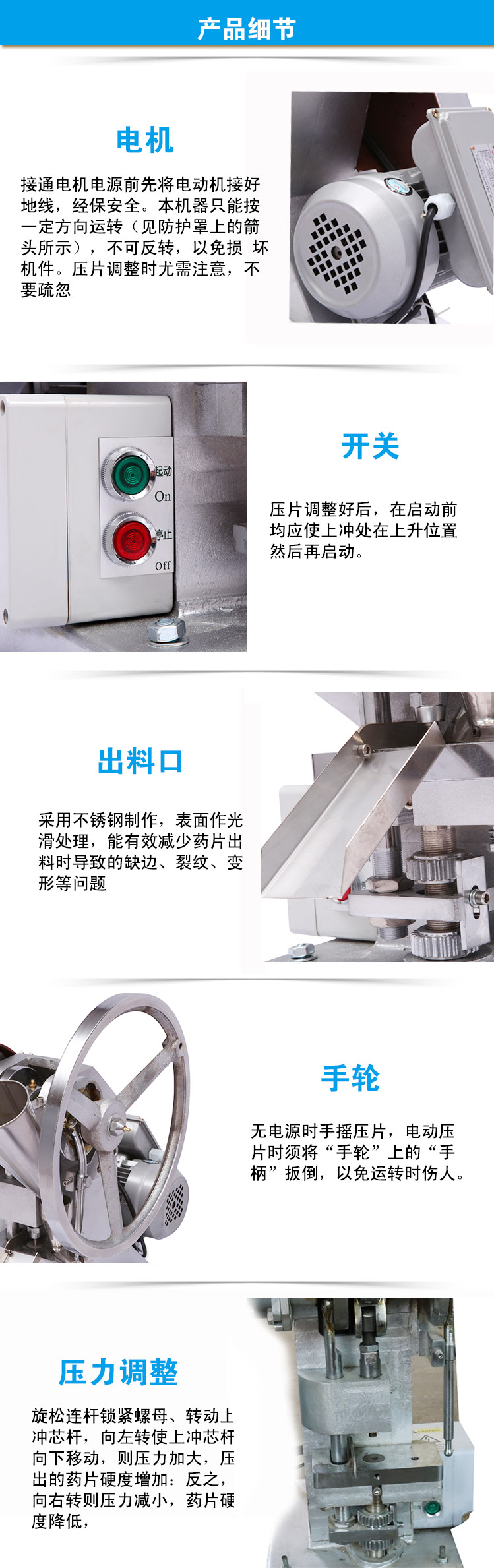 各种形状的模具。  单冲压片机能将粉粒状原料压制成片剂,可广泛适用于制药厂、化工厂、医院、科研单位、实验