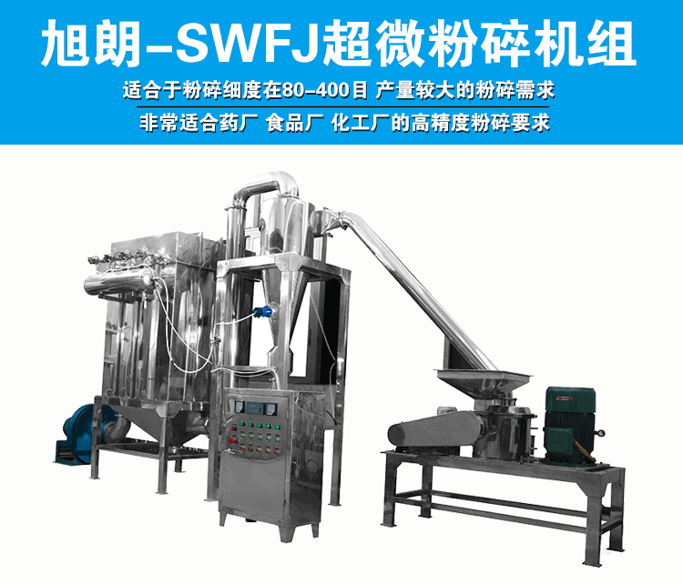 广州KY在线官网(中国)生产的SWFJ-15/20/30/60型超微粉碎机组主要适合于粉碎细度在80-400目、产量较大的粉碎 需求,非常适合药厂、食品厂、化工厂的高精度粉碎要求,粉碎细度可随意调节。 该粉碎机组主要由主机、辅机、电控箱三个部分组成,设计紧凑,结构合理,属风选式、无筛网。超微粉碎