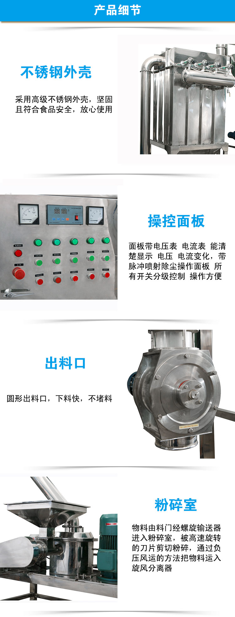 的粉碎及分级,该机已达到国际先进水平。能对大米、白糖、各种豆类、沉香木、花椒、胡椒、咖啡豆、可 可豆、茴香、八角、桂皮、孜然、豆蔻、百里香等各种物料起到良好的粉碎效果。 含油量特别高的物料如芝麻、核桃、花生、杏仁、瓜子仁等则无法单独粉碎。如需粉碎含油量特别高的物料,
