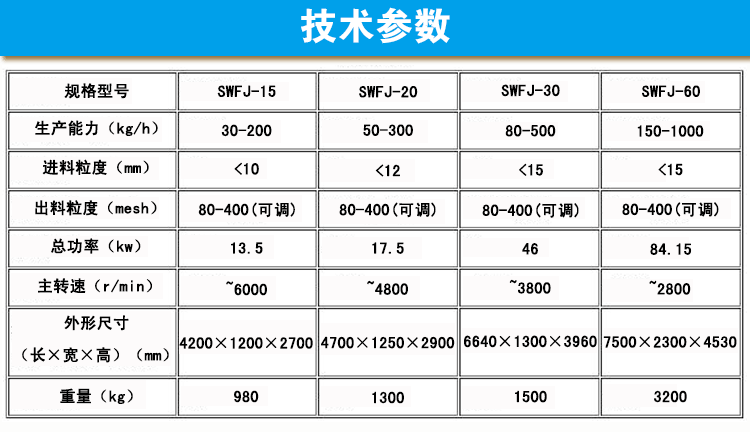 装置、引风电机造成负压。大功率引风电机不但可使输送管道形成负压,使达到要求的细粉自动被风力吸入 管道,而且巨大的风量还带走了粉碎腔内不断产生的热量,同时对粉碎机组的管道起到一个强有力的清理效 果。旋风收集器出料口加装了关风机,出粉口无粉尘飞扬,达到了清洁、环保、节约的效果。 粉碎对象 SWFJ-15/20/30/60型超微粉碎机组能处理如化学制品、食品、药品、化妆品、染料、树脂、壳物等多种物料