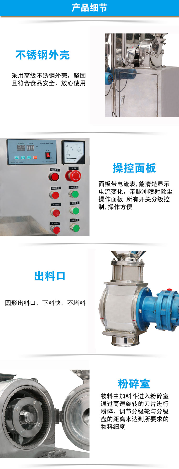 吸尘箱等部分组成,物料由加料斗进入粉碎室,通过高速旋转的刀片进行粉碎,调节分级轮与分级盘的距离来达